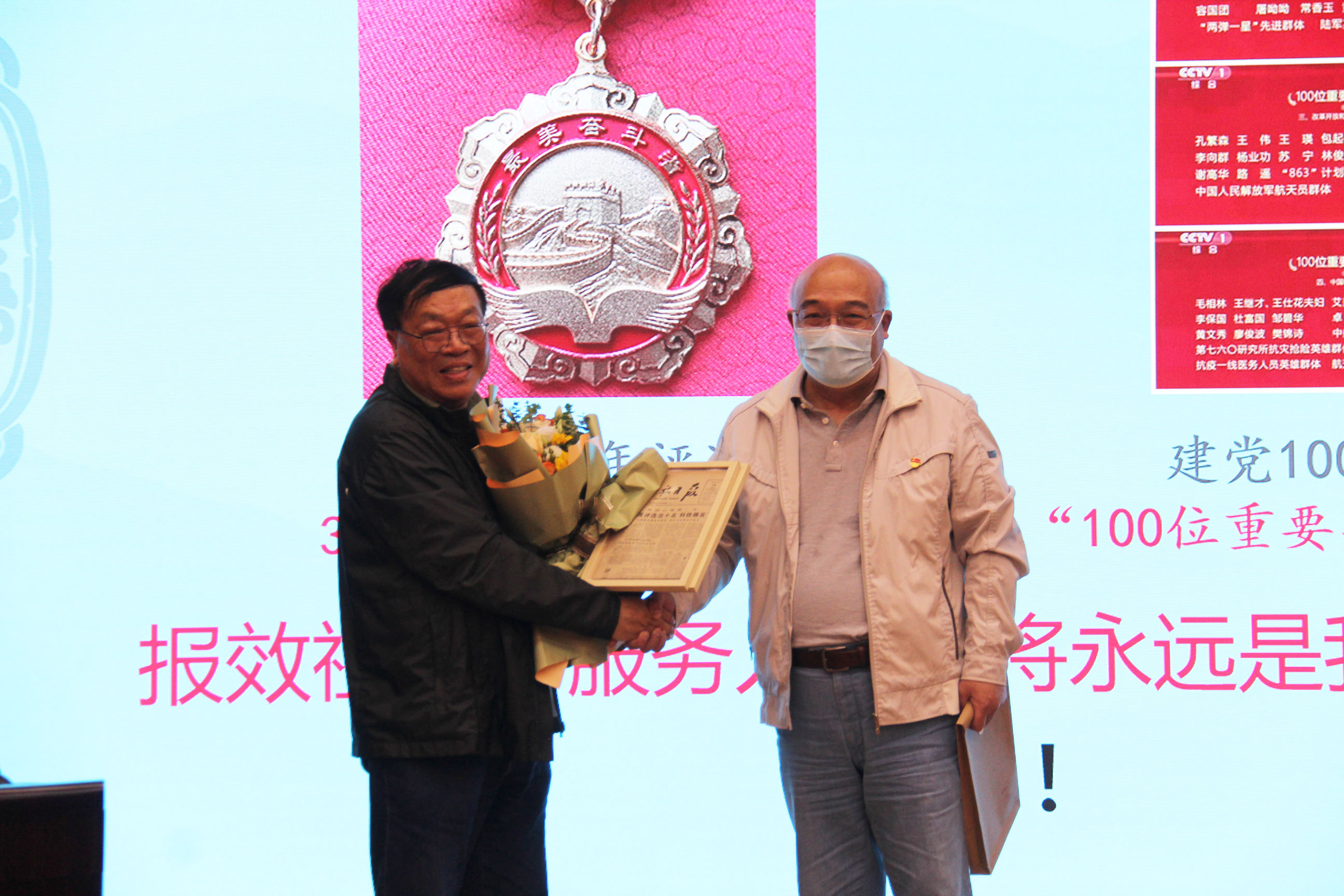 上海市劳模、公司高级技术专家徐斌同志代表公司为包教授献花致谢,并送上印有包教授先进事迹的老报纸。
